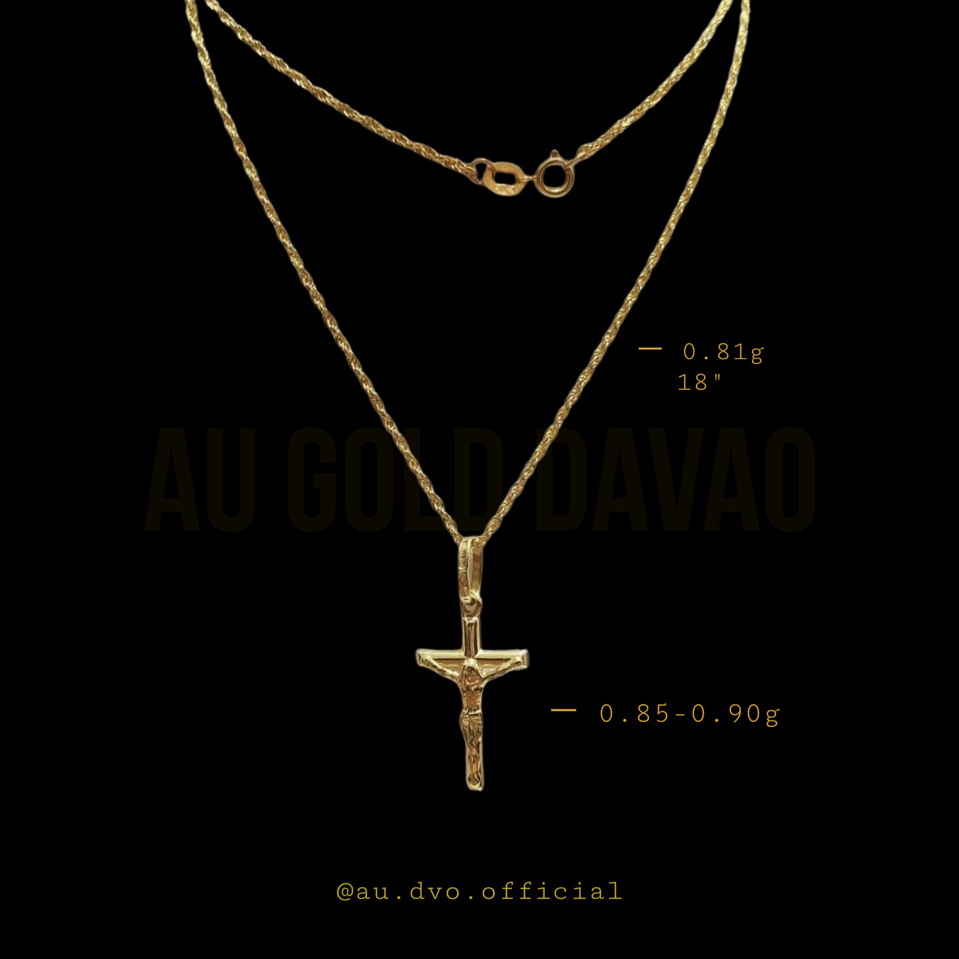 Showcase your faith and elegance with this 18-inch rope chain paired with a beautifully detailed Crucifix pendant. Made from genuine Saudi Gold 18K, this piece offers both timeless style and lasting value. The chain weighs approximately 0.81g, while the pendant adds 0.85–0.90g, making it lightweight yet luxurious.